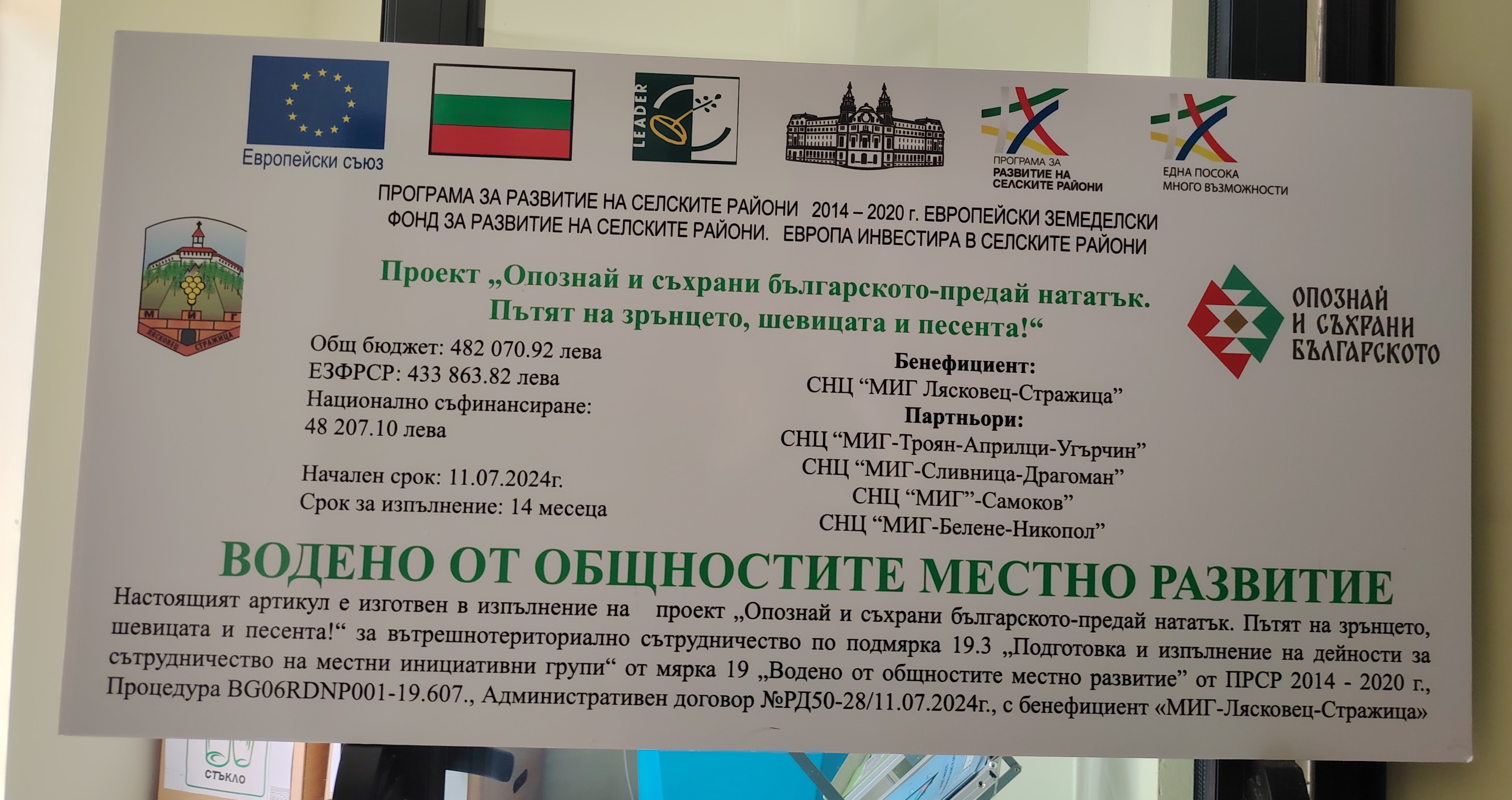 На 11 юли 2024г., СНЦ"МИГ-Лясковец-Стражица" подписа Административен договор №РД-50-28/11.07.2024г. за изпълнението на проект "Опознай и съхрани българското-предай нататък. Пътят на зрънцето, шевицата и песента!", подмярка 19.3 „Подготовка и изпълнение на дейности за сътрудничество на местни инициативни групи“ от мярка 19 „Водено от общностите местно развитие” от ПРСР 2014 - 2020 г., Процедура № BG06RDNP001-19.607. Дейностите по проета се изпълняват в партньорство с още 4 Местни инициативни групи. Договор!